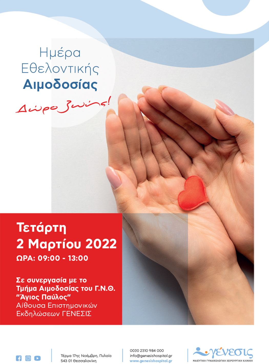 Για ακόμα μια φορά η Κλινική ΓΕΝΕΣΙΣ διοργανώνει την Τετάρτη 2 Μαρτίου 2022 (09.00 – 13.00) ημέρα Εθελοντικής Αιμοδοσίας στην