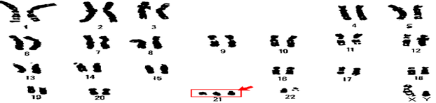Η παθογνωμονική διάγνωση του συνδρόμου Down, γίνεται με προσδιορισμό του καρυότυπου και μπορεί να γίνει με λήψη χοριακών λαχνών μεταξύ 9ης και 11ης εβδομάδας , και με αμνιοπαρακέντηση περί τις 19η ±2 εβδομάδες, με κίνδυνο αποβολής στο 0,2% των περιπτώσεων.